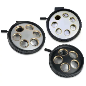 Four integrated filter holders with three standard filters and one empty holder for optional filters. All filters can be moved out of the optical path by pulling the lever.